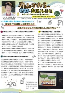 「片山かおるのちょっとカエル通信」135号を発行しました 3議会(第一回定例会)が2/16から始まりました。議会のお知らせになる「片山かおるのちょっとカエル通信」135号を発行しました。 すでに市長の施政方針への質疑は2/16.17に終了しましたが、市長公約をことごとく覆す施政方針です。 片山かおるの一般質問は2/27(金)15:30からの予定です。