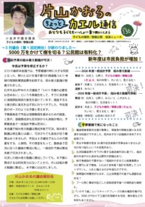 片山かおるのちょっとカエル通信133号 12月議会(第4回定例会)が11/28から始まってます。 議会のお知らせになる「片山かおるのちょっとカエル通信」133号です。 片山かおるの一般質問は明日12/4の14:00からと、12/7(日)の日曜議会では15:45から。