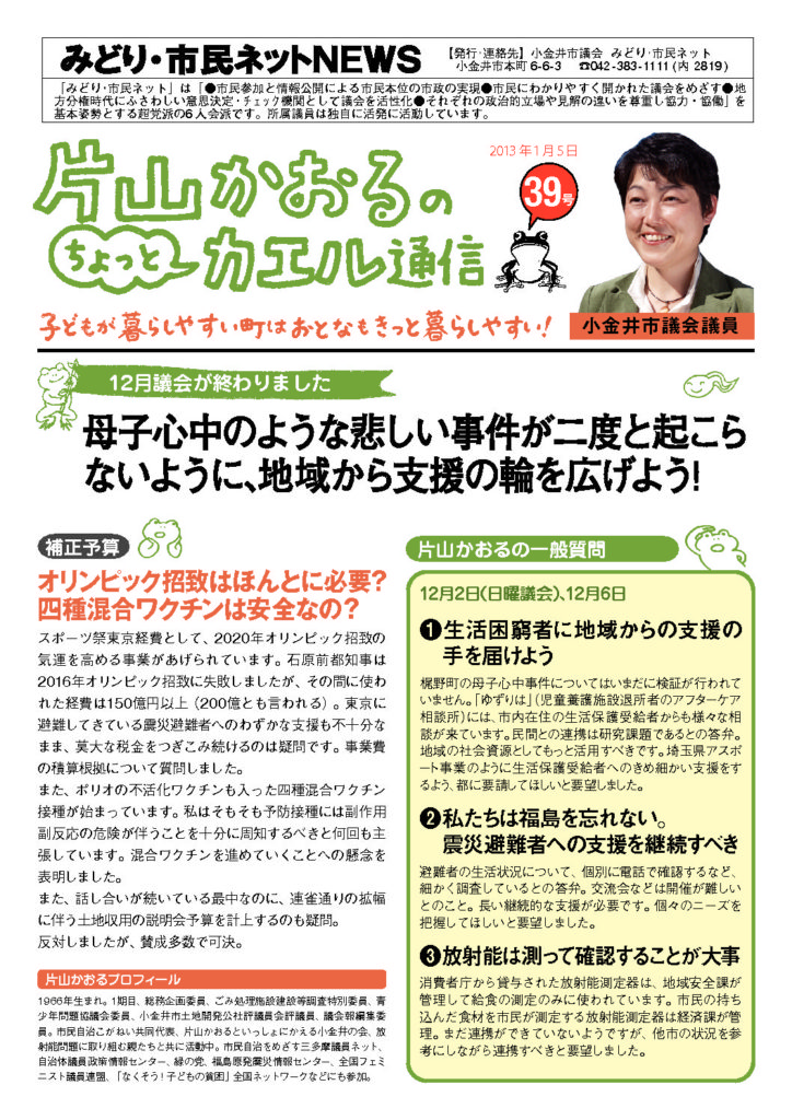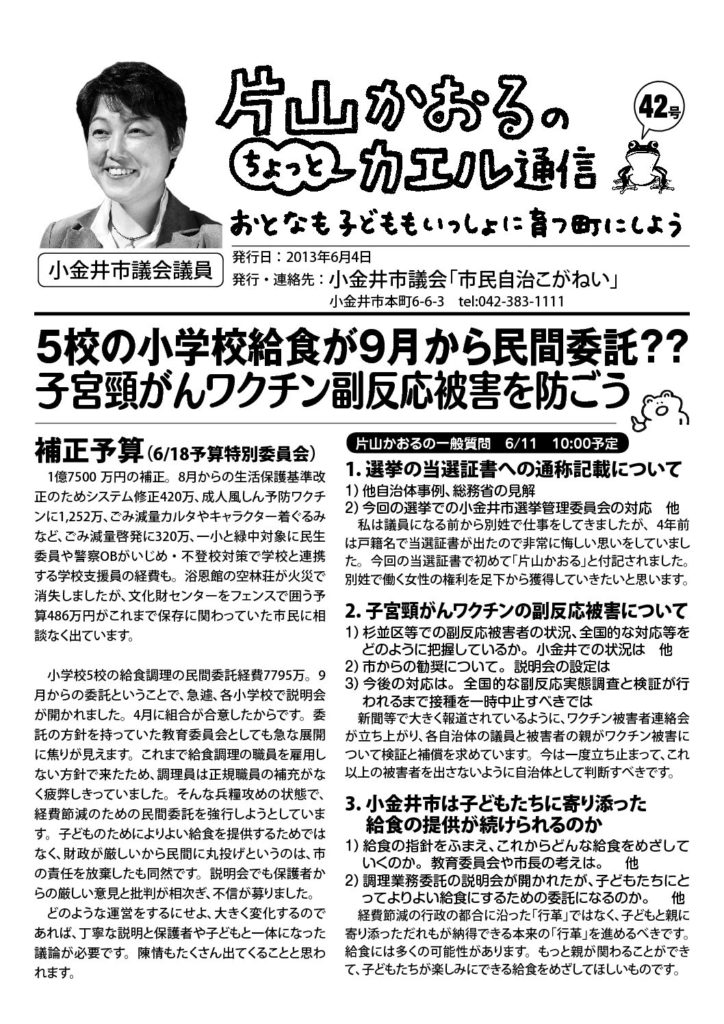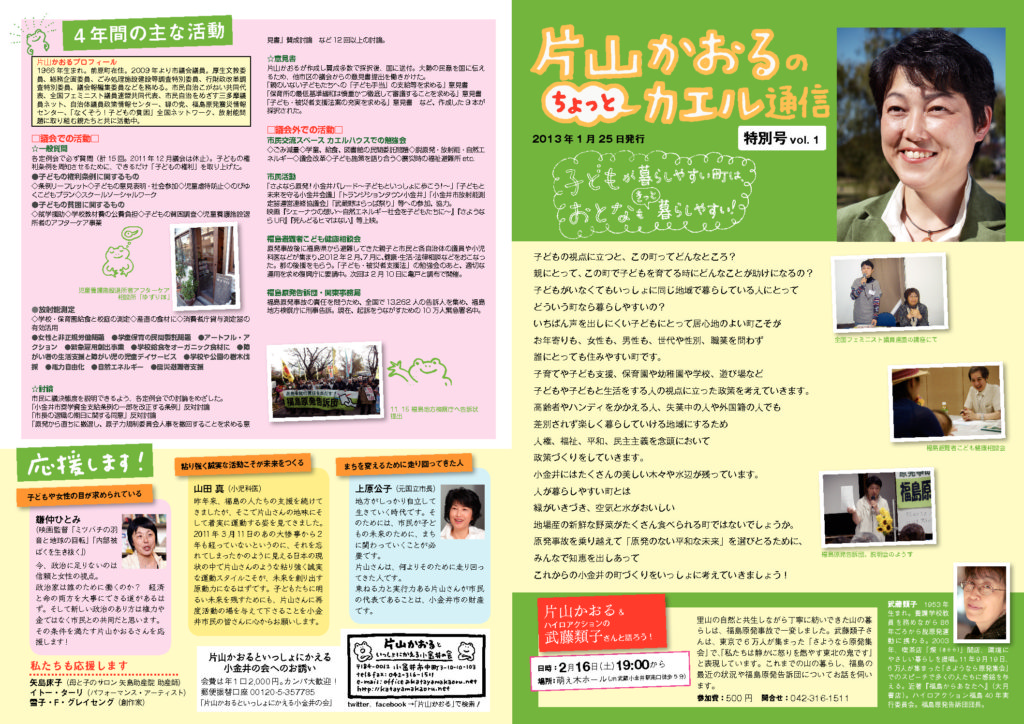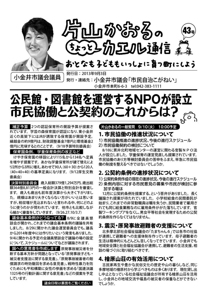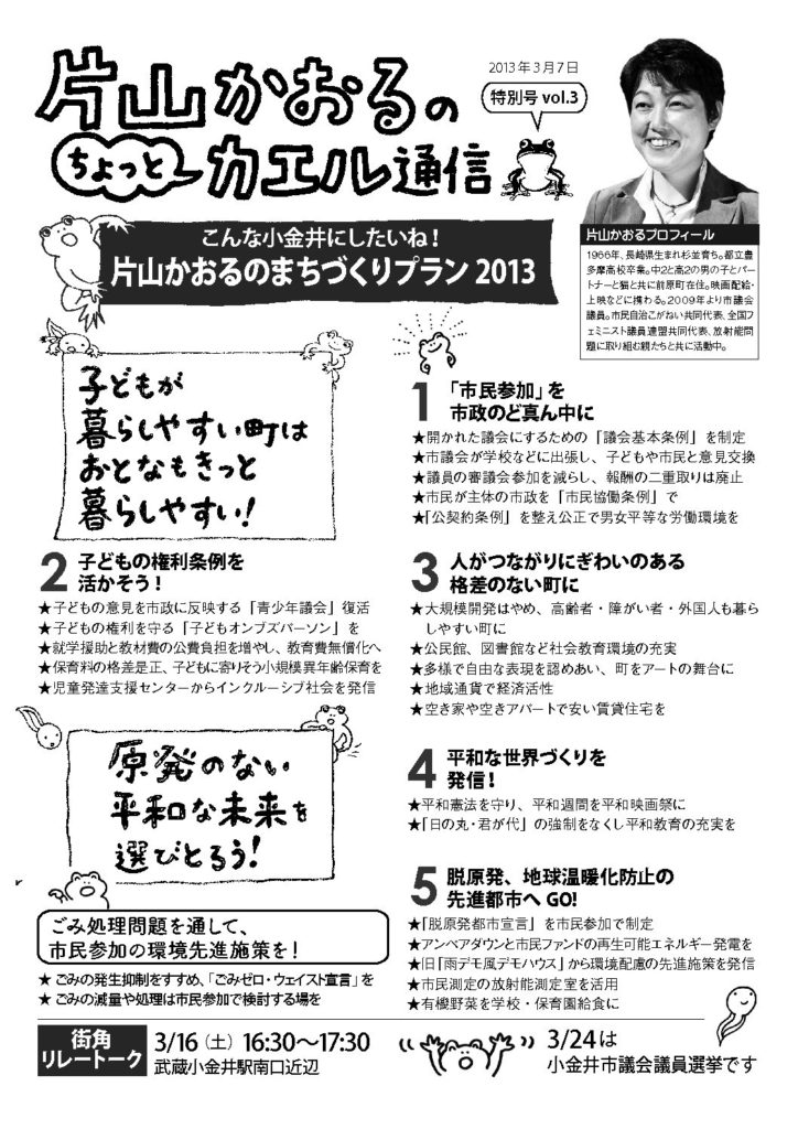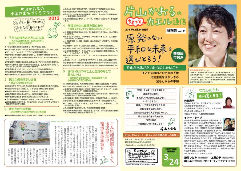 『カエル通信』のバックナンバーは、下記からPDF版をダウンロードしてください。また、「片山かおるといっしょにかえる小金井の会事務所」でも入手できます。お気軽にお問い合わせください。